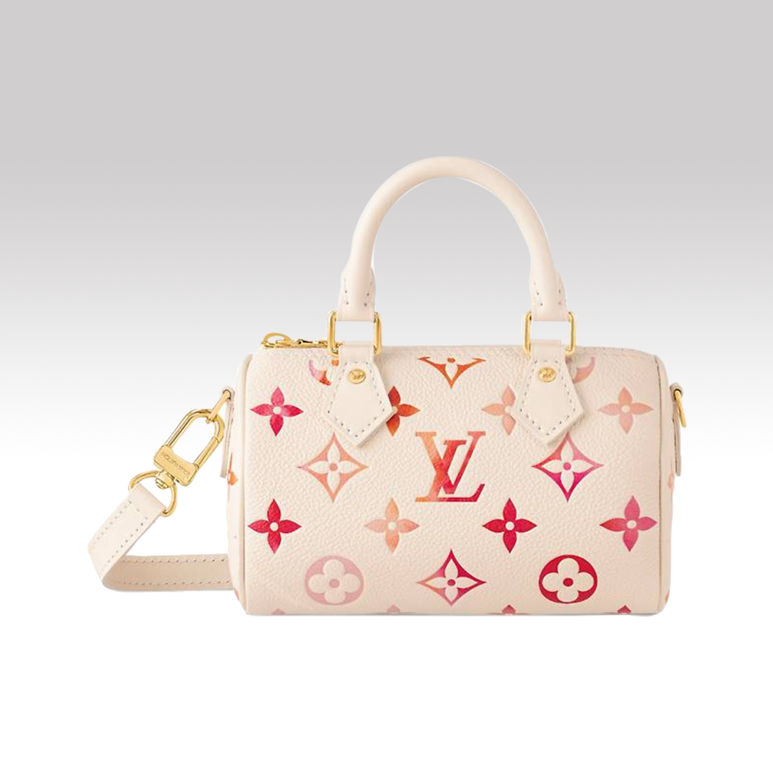 For the Sunrise Aquarelle collection, the Nano Speedy bag is revisited in Monogram Empreinte leather, which is digitally printed with sunrise shades to create a painterly, watercolor effect. This mini replica of the iconic Speedy has two handles and a removable, adjustable shoulder strap, which offer different looks and carry options.